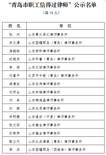 为进一步接受社会监督,现将“青岛市职工信得过律师”名单进行公示,如对公示名单有异议,请在5个工作日内(2022年10月24日至2022年10月28日)实名向青岛市总工会法律工作部反映问题。
