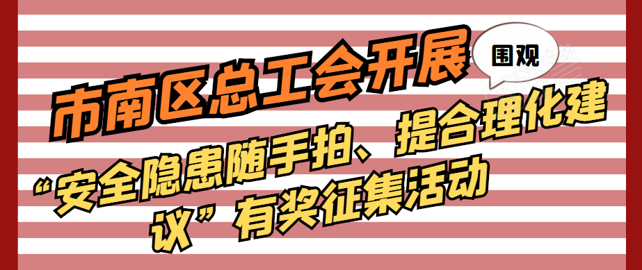 市南区总工会在安全生产隐患大排查中的积极作用,强化红线意识,树立底线思维,结合在全区企事业单位中开展“查保促”安全隐患拉网式大排查大整治专项行动,决定在全区各工会组织和职工中开展“安全隐患随手拍、提合理化建议”有奖征集活动。