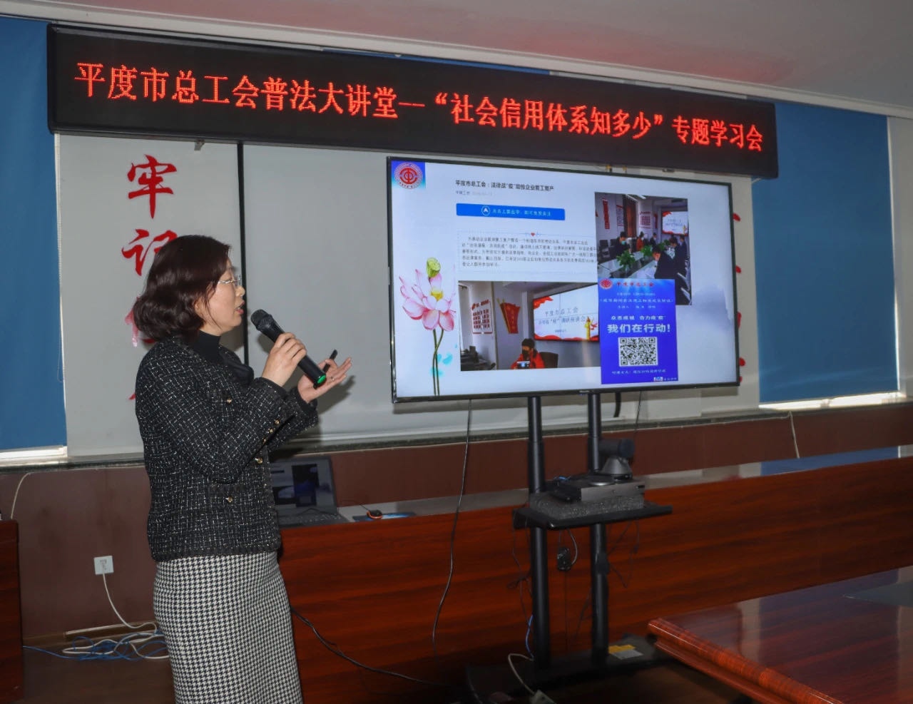 平度市总工会普法讲师团讲师杨萍以“诚信你我他,共建信用年”为主题,结合机关单位特点,着重讲解政务诚信的相关知识,并结合生活和工作中的大量实例,进行了深入浅出地解析。