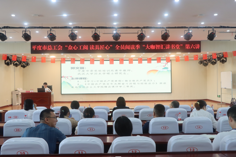 大咖智“汇”讲书堂是平度市总工会联合樊登读书举办的系列活动,邀请樊登读书翻转师、高级家庭教育指导师等走进文化宫开办讲座,课堂采用翻转课堂形式进行,参与性高、互动性强。职工按需提前进行预约报名。目前,活动已成功举办10场次,课程内容涵盖《论语》解读、家庭教育、个人成长,吸引了一批“忠实粉丝”,为职工提供了有深度、有温度的阅读体验和文化服务。3次邀请平度市委党校教师进行授课,从党校校长讲作风能力提升到骨干教师讲意识形态再到青年教师讲党章,将广大职工理论学习提升到新高度。