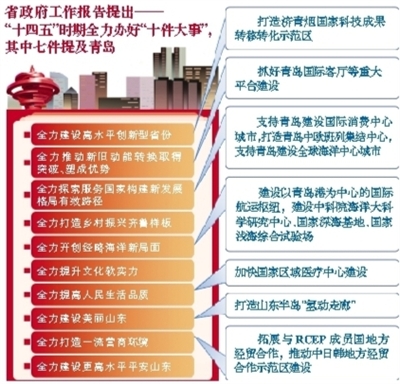 2日上午,省十三届人大五次会议开幕,省长李干杰代表省政府作政府工作报告。报告中,与青岛相关的工作受到高度关注,先后30余次直接或间接提及“青岛元素”,特别是有关开放、创新、经略海洋等方面的内容连续提到青岛,“上合示范区”等在报告中被多次提及。其中,全省“十四五”时期经济社会发展主要目标任务中“圈定”了“十件大事”,更是有7件都与青岛发展密切相关。