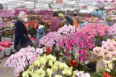小年临近,青岛年宵花销售日益火爆。在位于崂山区的枯桃花卉市场,姹紫嫣红的蝴蝶兰花海中,蓝绿色的“马卡龙色”蝴蝶兰格外惊艳。