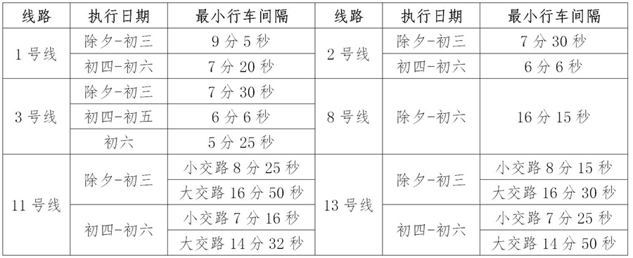 今天,记者从青岛地铁集团获悉,春节假期期间,青岛地铁各线路行车安排将有所变化——除夕至初三期间,外出客流大幅减少,线网运力随之进行调整,在方便出行的同时,兼顾节能减排,响应低碳发展;初四、初五走亲访友,各线路恢复日常周末安排;初六假期步入尾声,3号线增加运力,行车间隔压缩至5分25秒;其他线路仍执行日常周末安排。