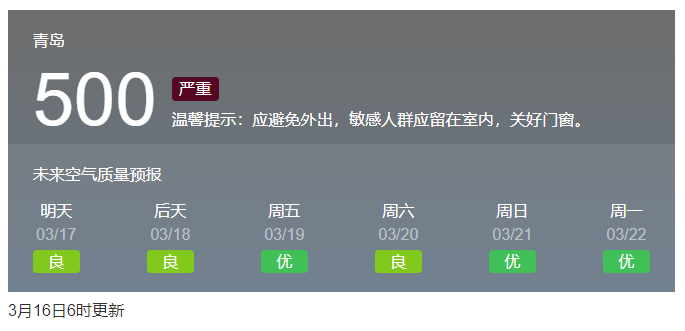 今天(3月16日)早晨,气象信息显示,青岛也处于“严重污染”状态。市民“应避免外出,敏感人群应留在室内,关好门窗”。