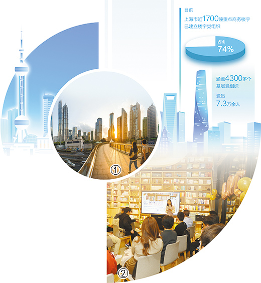 放眼整个上海,党建引领下的“楼委会”“楼治汇”等自治平台正在商务楼宇中不断涌现。目前,上海全市近1700幢重点商务楼宇已建立楼宇党组织,占比达74%,涵盖基层党组织4300多个,党员7.3万余人,涌现出金虹桥国际中心、恒隆广场、国金中心等年税收“百亿楼”的“善治理”典型。