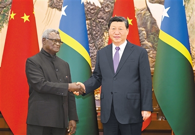 习近平指出,中国和所罗门群岛是彼此值得信赖的好朋友、可以依靠的好兄弟。建交以来,两国友好合作后来居上,走在了中国同太平洋岛国关系前列,成为不同大小国家和发展中国家团结合作、携手发展的典范。事实证明,中所建交顺应时代潮流,契合国际大势,符合两国人民根本利益,是正确选择。中方愿同所方加强战略沟通,深化各领域合作,推动两国全面战略伙伴关系行稳致远、好上加好,更好造福两国人民。