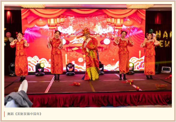 欢乐喜庆的舞蹈《发财发福中国年》拉开了联欢会的帷幕。
