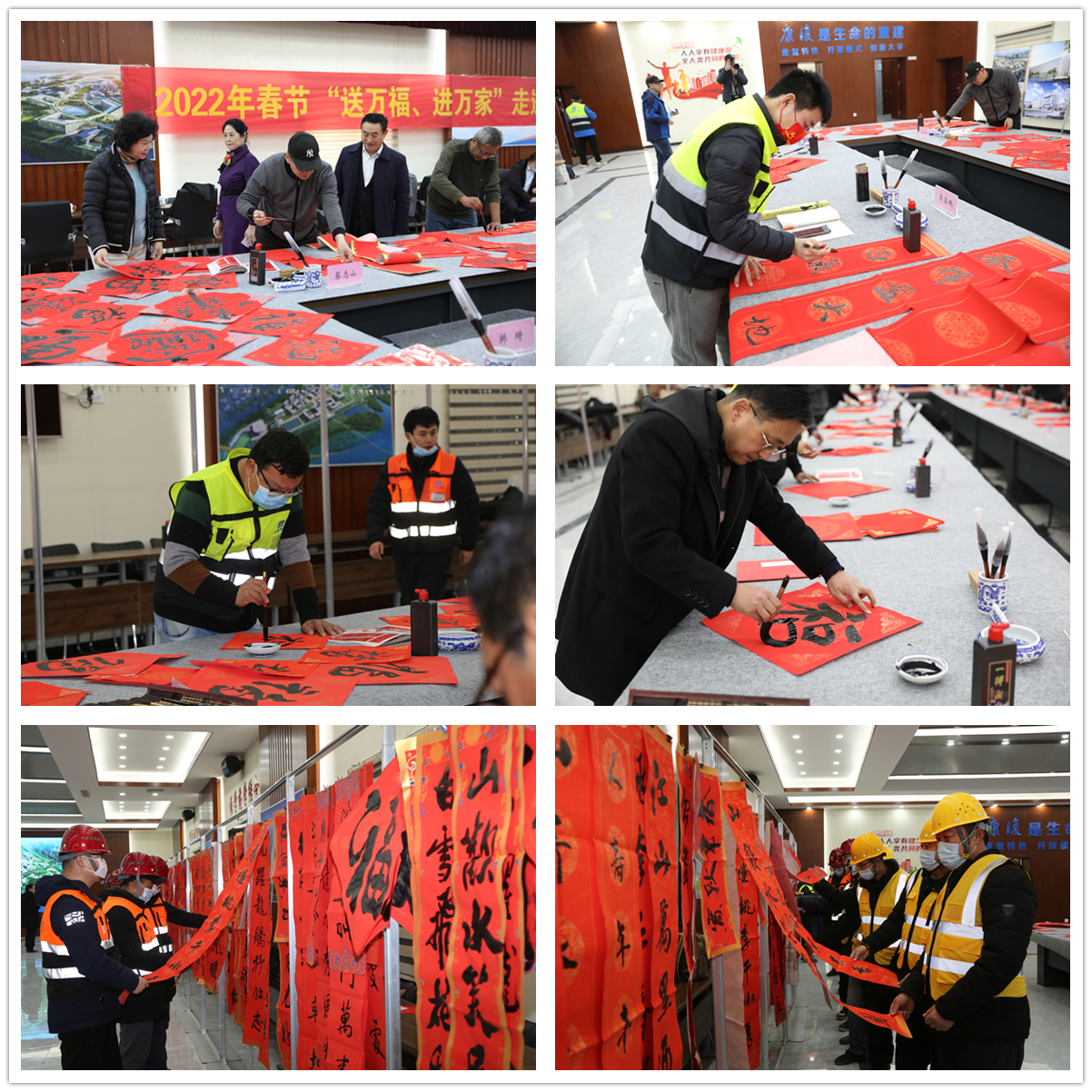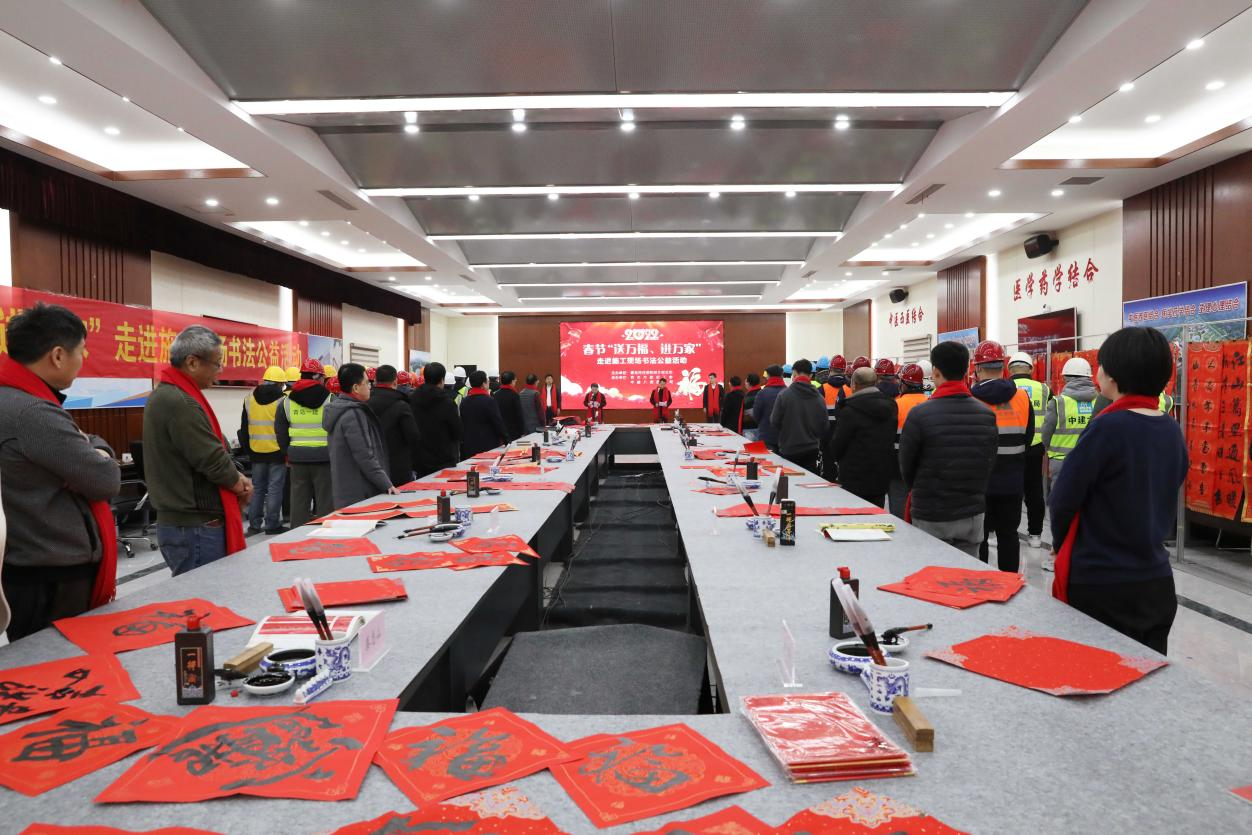 1月19日下午,青岛市建设工会在康复大学项目开展2022年元旦春节期间“送万福 进万家”书法公益活动。青岛市住房和城乡建设局副巡视员蒲一江,总经济师、一级调研员、青岛市建设工会主席于军,中建八局四公司青岛公司党总支副书记鲍英伟及住建系统书法工作者和爱好者、施工现场一线工人代表参加活动。