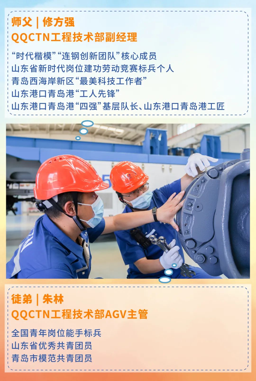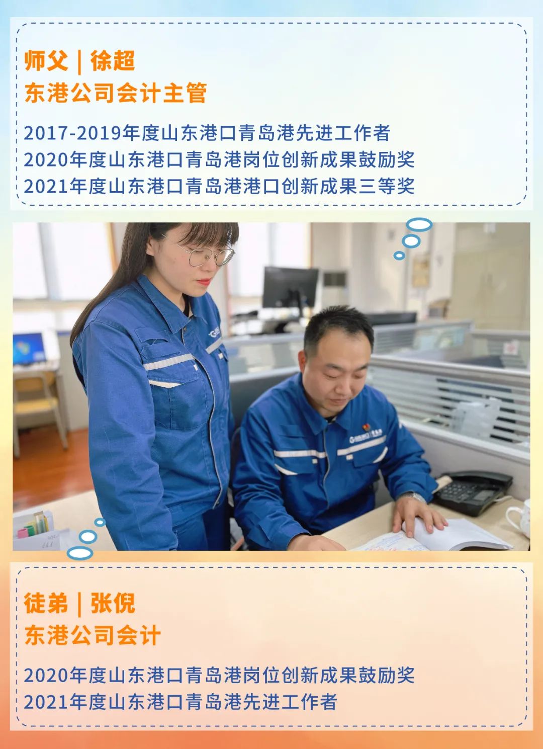 师父,感谢您不厌其烦地教我技能,一次次传授我经验,让我能牢牢拿好接力棒。带着师父对我的期望,我将脚踏实地、创新进取,为加快建设世界一流的海洋港口作出自己更大贡献。
