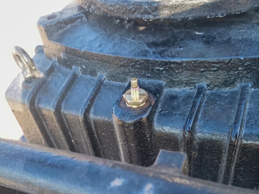 脱缆钩快速排油设施,由进油口气门嘴与排油口出油阀两部分组成,在排油时,可以使用气筒通过气门嘴向齿轮箱内加压,驱动箱体内的废油流出,排油口的出油阀则连接了软管,可直接将废油引流至收集桶内,原本放油工作需要持续近一个小时,现在仅需10分钟即可完成,同时也彻底解决了废油飞溅的问题,提升作业现场环境文明。