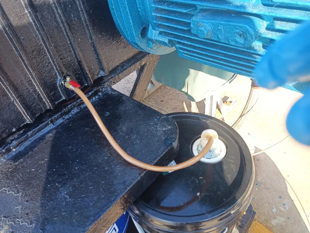 原脱缆钩齿轮箱内润滑油靠自流方式排空,旧齿轮油黏度大,流速慢,影响更换效率,且废油自流期间极易受大风影响造成飞溅,导致设备、地面油污。