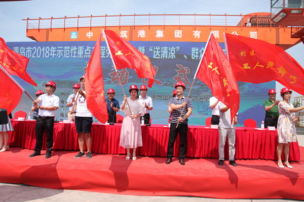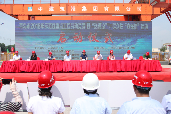 7月20日上午,青岛市2018年重点工程劳动竞赛暨送清凉、群众性“查保促”活动启动仪式在中建筑港集团有限公司承建的青岛地铁8号线(B1包)土建01工区隆重举行。