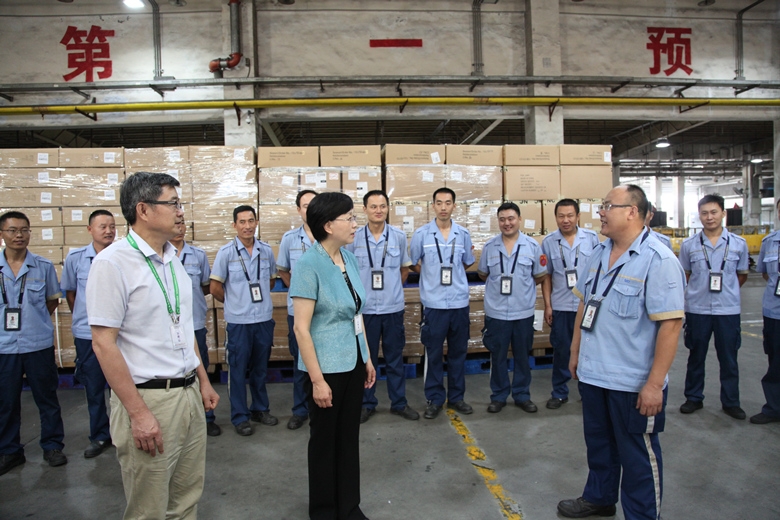 随后,调研组来到了物流发展公司国际货库,刘圣珍主席与 “飞虎理货”班组成员进行了亲切交谈,询问了职工的班制情况及生活状况。物流公司的同志也向调研组汇报了物流发展公司在优化营商环境方面的主要举措及班组建设的亮点工作。