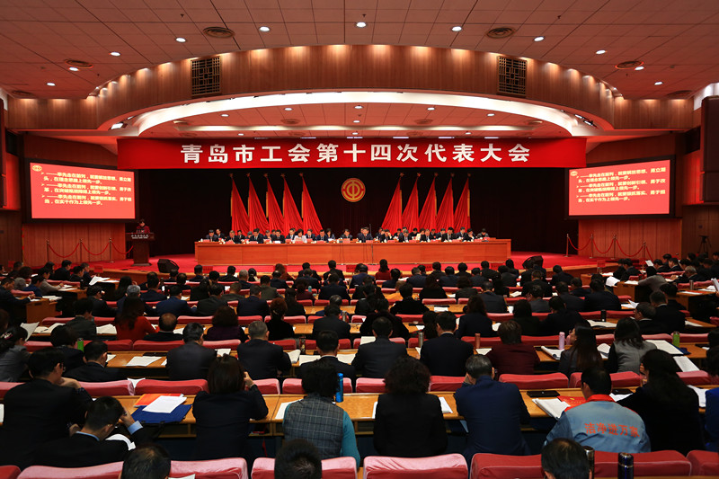 12月17日上午,青岛市工会第十四次代表大会在市级机关会议中心三楼会堂召开全体代表大会,市人大常委会副主任、市总工会主席刘圣珍代表青岛市总工会第十三届委员会作报告。市总工会党组书记、常务副主席彭建国主持会议。