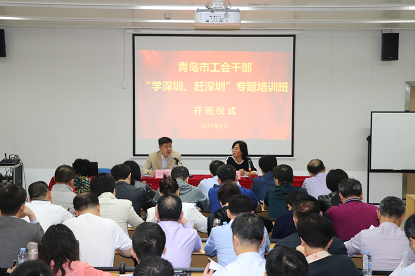 南国春潮涌,催人砥砺行。3月31日上午,青岛市工会干部“学深圳、赶深圳”专题培训班在深圳市总工会职工继续教育学院正式开班。进一步落实市委“精兵强将攻山头,典型引路稳阵地”两条工作线的部署要求,放大坐标找不足,提高标准找差距,瞄准“领头雁”“排头兵”,寻找青岛工会与先进地区工会的差距,全面深入地学习深圳工会在基层组织建设、职工维权服务、产业工人队伍建设、“智慧工会”建设方面的先进经验和创新做法,不断提升做好群众工作的能力素质,团结带领全市广大职工为加快建设开放、现代、活力、时尚的国际大都市建功立业。青岛市总工会党组书记、常务副主席彭建国出席并作开班动员。