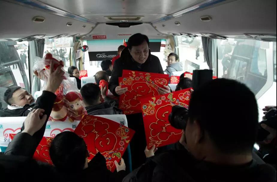 海信工业园候车区内,市总工会和交运集团将工业园区作为临时候车区,每条线路安排专人带队,上车后统一检票,简化乘车流程,为新市民返乡提供便捷;贴心地设置了“学雷锋志愿服务点”,向候车新市民免费发放热牛奶、热姜糖水、小米粥等早餐,还精心准备了装有食品、鼠年吉祥物和福贴的新春福袋,为新市民送去温暖和祝福。