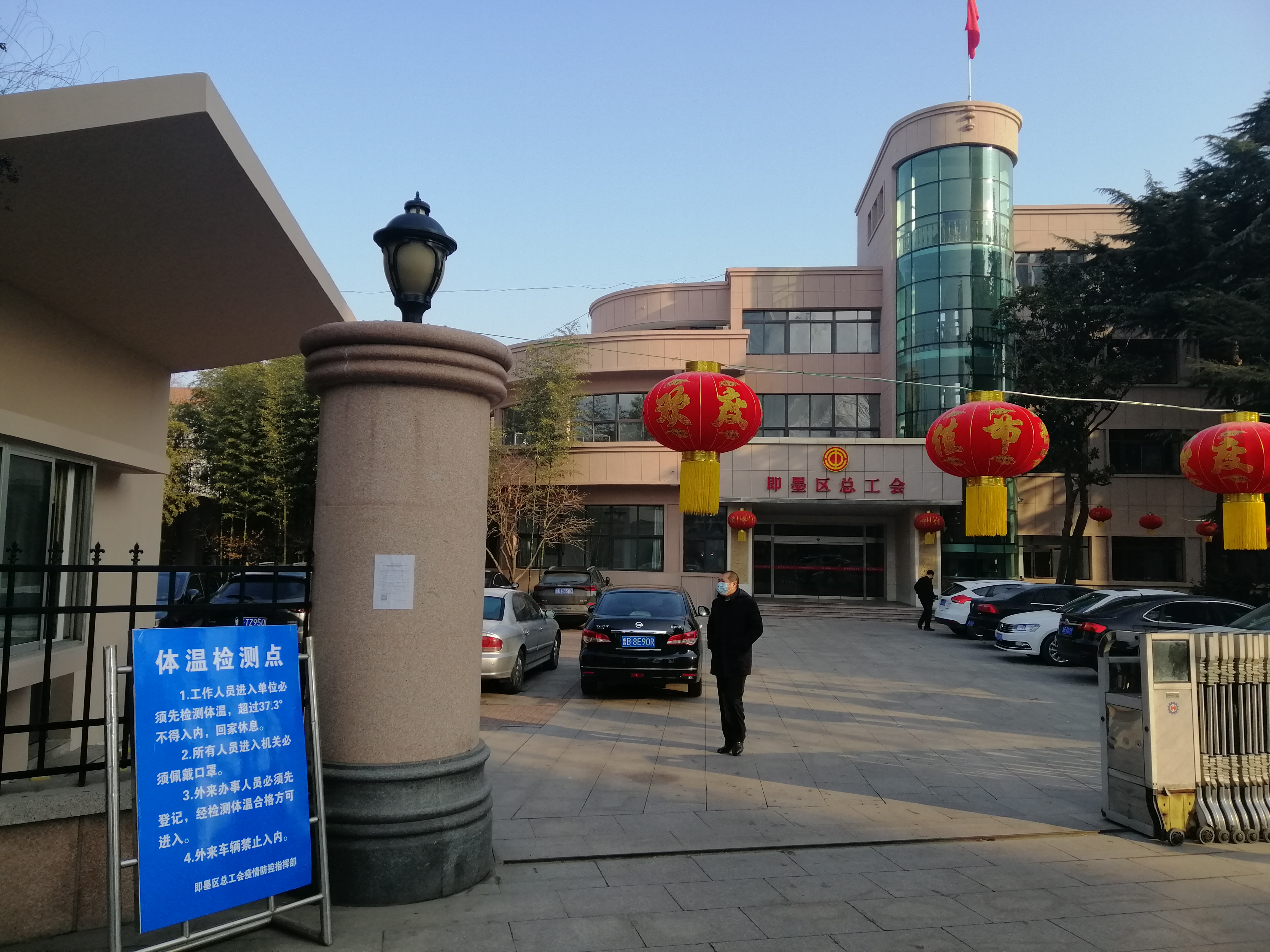 早晨不到8:00,即墨区总工会就在单位大门口设置体温监测点,张贴通告,要求所有进入区总工会的工作人员和到访者必须佩戴口罩,接受体温监测,体温超过37.3度禁止入内,外来人员必须登记,外来车辆严禁入内。
