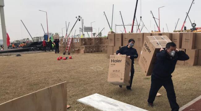 在雷神山医院工地上,由于现场缺乏运输的机械设备,为了保证工期,海尔突击队队员只能靠肩扛人背这种最原始的运输方式,将300台热水器搬到安装现场。谈及现场的工作,海尔突击队现场负责人华聂说:“我们一定听从现场指挥,齐心协力。在这场举国上下参与的抗击疫情的战役中,我们海尔人会冲在前边,确保雷神山医院全品类家电产品安装保质保量完成。我们也希望这次的疫情能早点过去,让全国人民安安心心过年、安安心心回家、安安心心上班。”