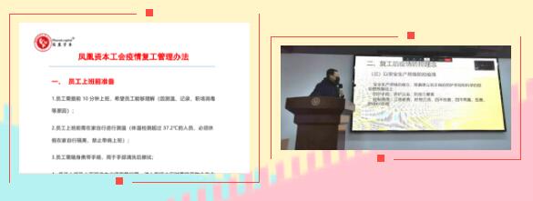 崂山区金家岭街道凤凰资本有限公司工会委员会在企业复工前,制定“凤凰资本疫情复工管理办法”,组织职工在上岗前进行防疫知识学习,多方筹措采购职工防护用品,并严格按区委、区政府复工复产要求,监督各部门负责人责任到位、严密防控。结合公司工会工作实际,充分发挥工会组织的桥梁纽带作用,在加大宣教工作力度的基础上,组织开展“查隐患、保安全、促发展”群众性安全生产活动,切实加强疫情防控期间的职工安全生产和劳动保护工作,积极配合公司所在地——上实中心园区物业,做好员工健康检测和车辆消毒防疫等防控工作。