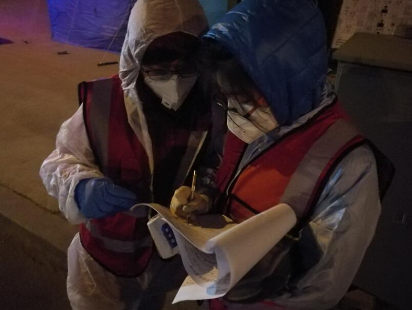 深夜11点正是人们刚刚进入梦乡的好时候,多想再睡一会儿啊!然而铃声就是命令,铃声就是冲锋号。她们立即穿好防护服,克服深夜的恐惧,勇敢冲进漆黑的夜幕,提前赶到阻疫检查卡口站,与区卫健局、公安分局、交警大队的同志们汇合后,便投入到紧张的“战斗”中。