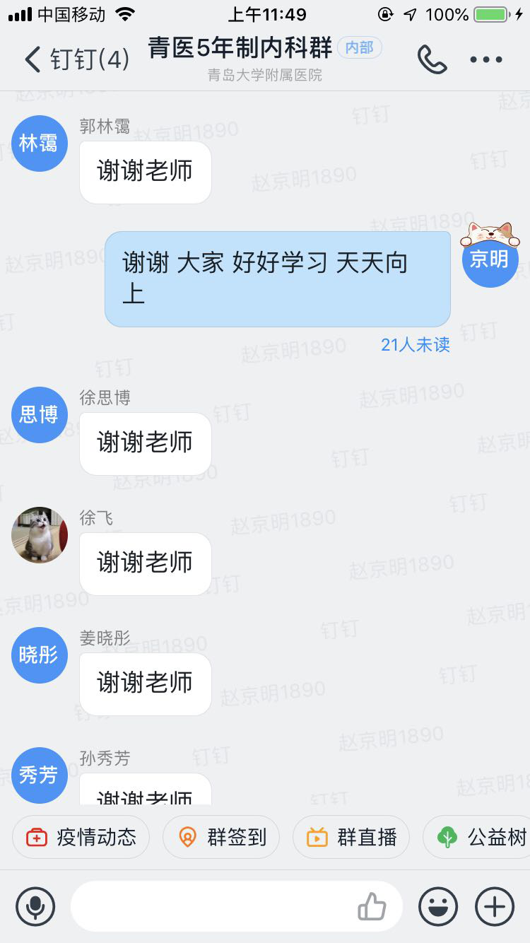 因为疫情防控原因,目前各大院校不能进行集中课堂教学,响应青岛大学“停课不停教”的号召,又因为身在武汉救援,不想耽误学生学习的赵京明便利用休息时间给自己的学生上网课。