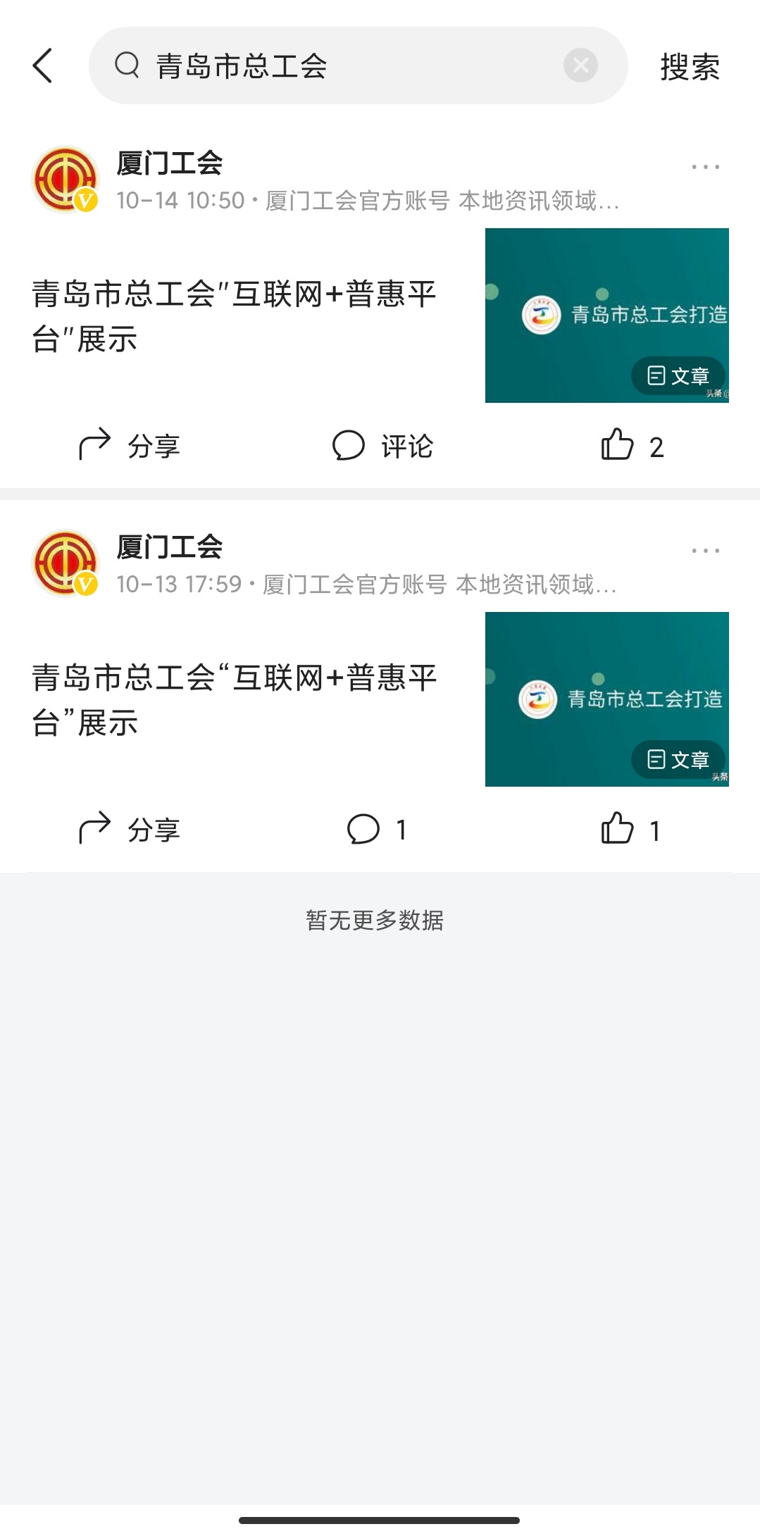 2、保存下图到相册(打开“今日头条”立即看到)或在今日头条搜索“厦门工会”进入厦门工会头条号主页,在搜索栏输入“青岛市总工会”,为“青岛市总工会‘互联网+普惠平台’展示”评论、点赞、分享!
