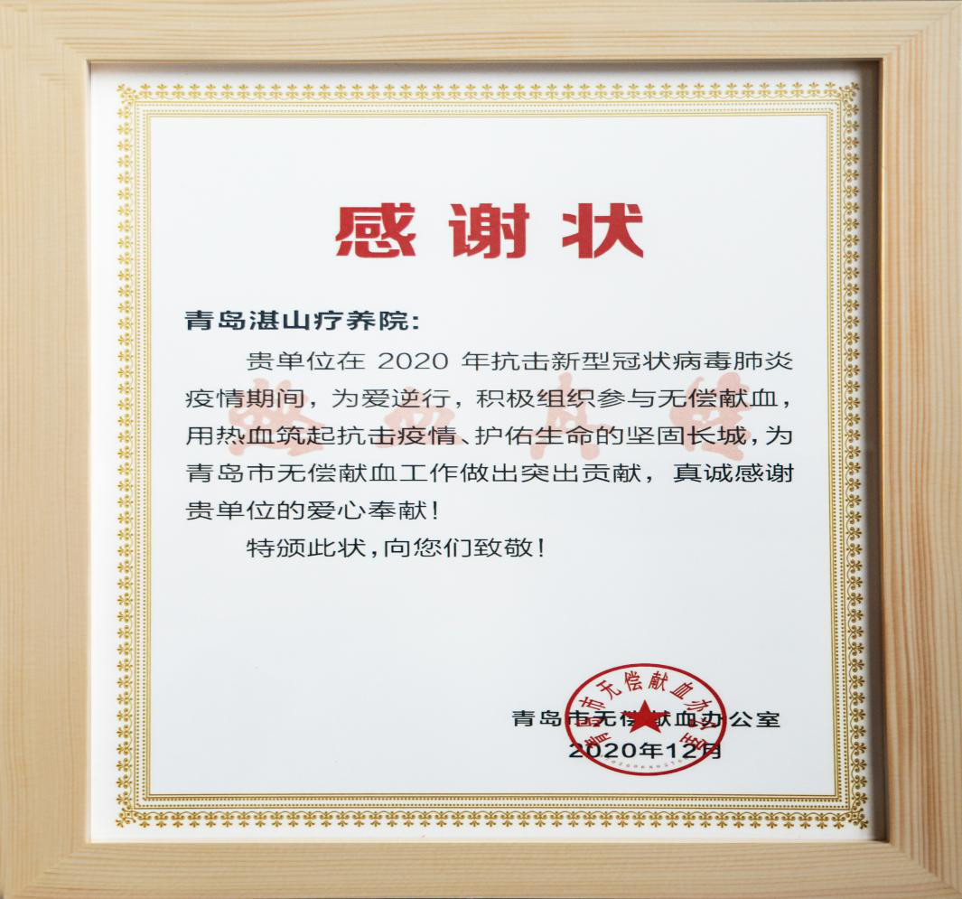 2020年,突如其来的新冠疫情打乱了人们的正常生活,血液库存出现不足。湛山疗养院党委带领全院职工在做好防控的同时,主动承担社会责任,组织开展了“众志成城公仆心,不负韶华勇担当”主题党日活动,为疫情防控无偿献血4400毫升,用热血筑起抗击疫情、护佑生命的坚固长城。日前,青岛市无偿献血办公室颁发感谢状,感谢湛山疗养院在2020年抗击新冠疫情期间为青岛市无偿献血做出的突出贡献。