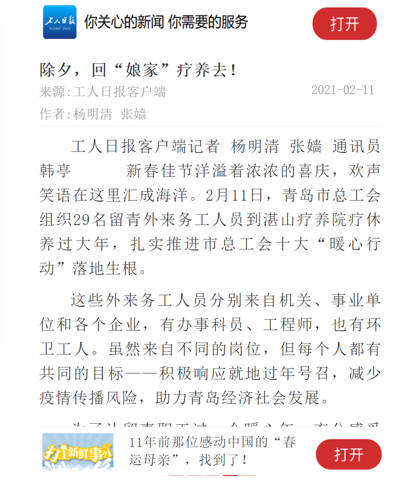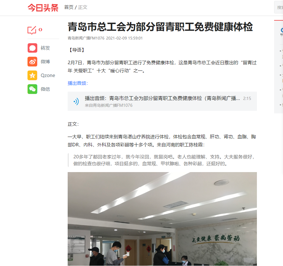 大众日报、工人日报、青岛日报、今日头条、蓝睛等新闻媒体相继报道湛山疗养院春节期间为留青职工开展的健康体检和疗休养工作,给予高度肯定。