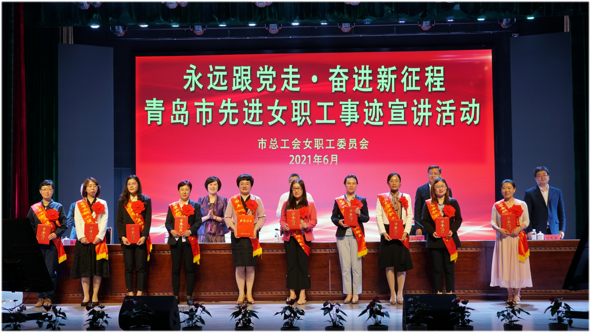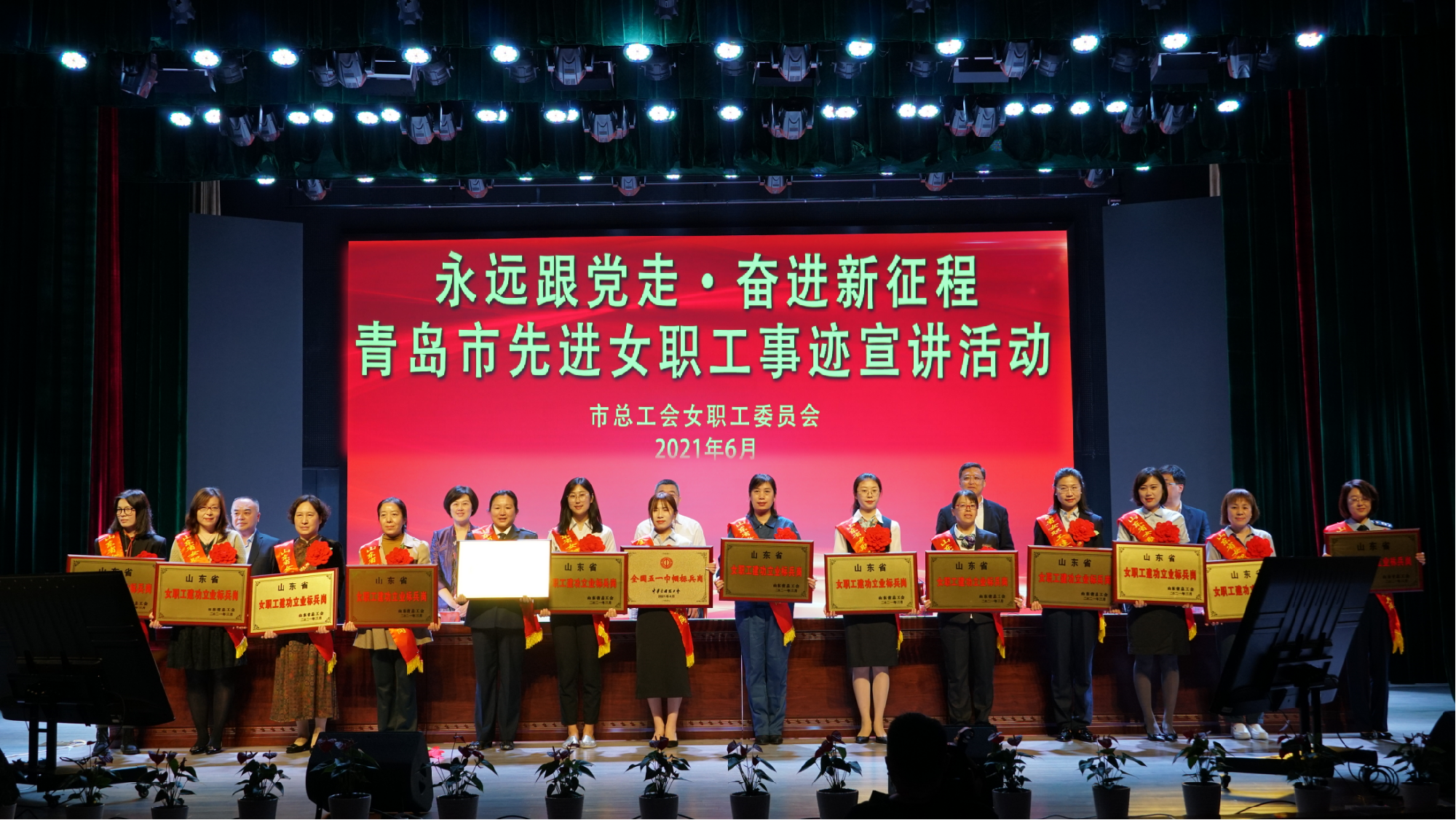 6月3日,青岛市总工会女职工委员会在青岛市工人文化宫工人剧场举办以“永远跟党走·奋进新征程”为主题的青岛市先进女职工事迹宣讲暨“三种精神”教育基地观摩活动。市总工会党组书记、常务副主席彭建国出席活动并讲话,市总工会领导干部、一级调研员出席活动。市总工会第六届女职工委员会委员,各区市总工会、各市直工会负责女职工工作的同志,以及今年受表彰的全国、全省女职工先进集体和先进个人参加了活动。