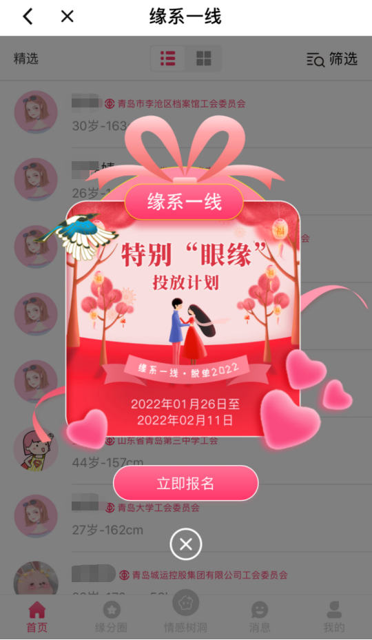 由青岛市总工会主办的“缘系一线”线上单身职工春节联谊活动自1月24日开始,至2月11日圆满结束。市总工会作为职工的“娘家人”,关心关爱广大职工,在春节期间积极为原地过年职工谋幸福、办实事,围绕“缘系一线”婚恋服务品牌赋能增效,结合疫情形式变化和要求,采用线上婚恋交友新方法,打造单身职工社交新方式,推动婚恋服务工作新模式,提升单身职工的生活品质和幸福指数,切实有效解决众多单身职工的婚恋问题。