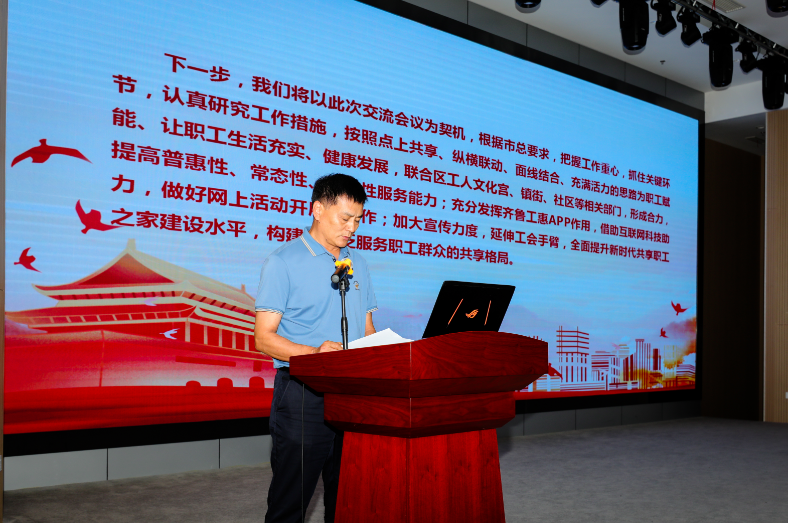为创新发展新时代区域共享职工之家建设管理工作,交流经验做法,部署工作任务,全面提升新时代区域共享职工之家服务水平,2023年7月5日,青岛市总工会在莱西市宏远桃园东方工会联合会新时代区域共享职工之家,召开全市北部片区区域共享职工之家建设管理工作交流会议。青岛市总工会副巡视员阮丁出席会议并讲话。