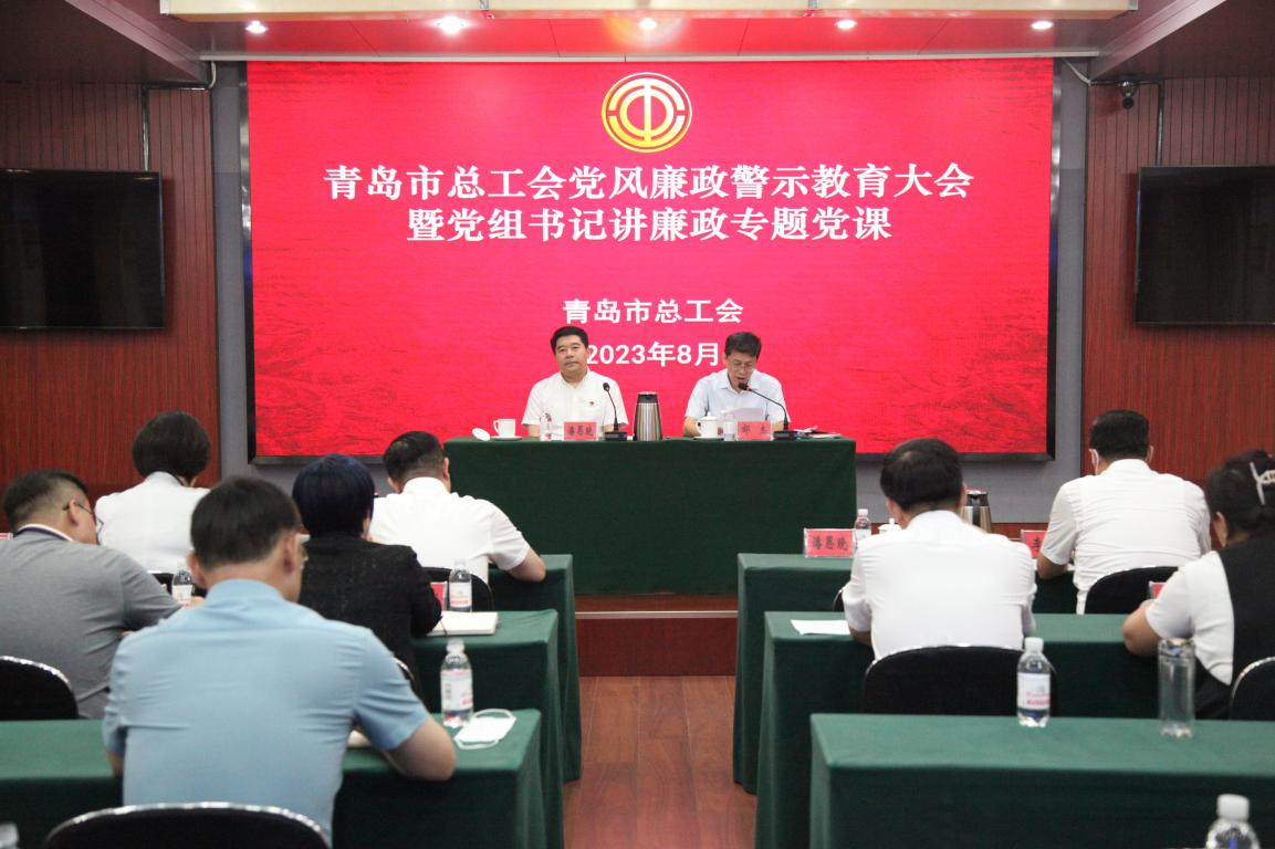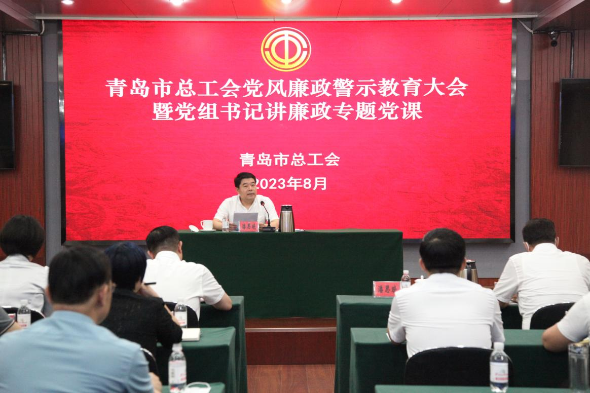 为进一步深化作风能力,优化营商环境,推进学习贯彻习近平新时代中国特色社会主义思想主题教育走深走实,认真落实省、市党风廉政警示教育大会精神,加强党风廉政建设和反腐败工作,8月28日上午,市总工会召开党风廉政警示教育大会暨党组书记讲廉政专题党课。会议传达了《关于市直机关近年来处级及以下党员干部违纪违法案件情况的通报》。市总工会党组书记、常务副主席潘思晓为市总工会党员干部做了一堂生动的廉政专题党课。组织观看了廉政警示教育专题片——《失守的“红线”——青岛市土地整治领域违纪违法案件警示录》。