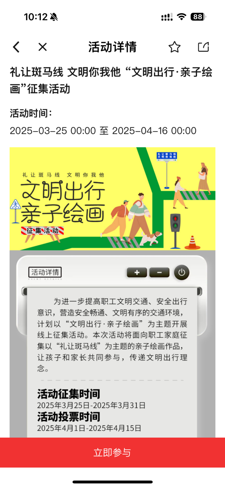 活动依托“齐鲁工惠”APP开展,以“礼让斑马线”为主题,广泛面向职工家庭征集亲子绘画作品,构建起了“工会搭台、家庭参与、社会联动”的全新文明创建模式。活动一经上线便引发热烈反响,累计浏览量高达16115次,共收集到72幅饱含创意与文明的作品。后续将采取“网络投票”的评审形式,评选出优秀作品50副。